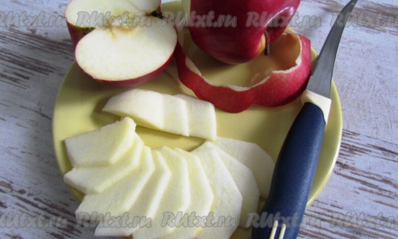 - Выложите на тесто яблоки, посыпьте корицей и сахаром.